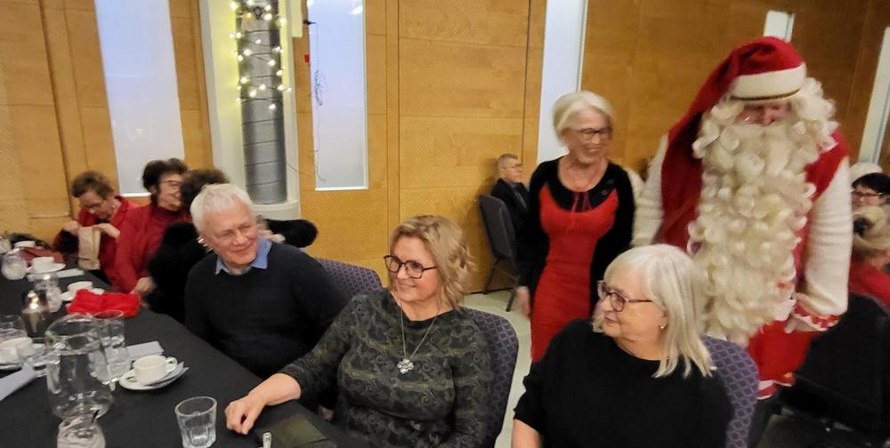 Laulunautinnon jälkeen kahvittelun ja jälkiruuan lomassa saapui itse Joulupukki ilahduttamaan meitä pienten jouluisten pussukoiden kera. Kaikki olivat olleet kilttejä ja ansainneet jouluisen yllätyksen.