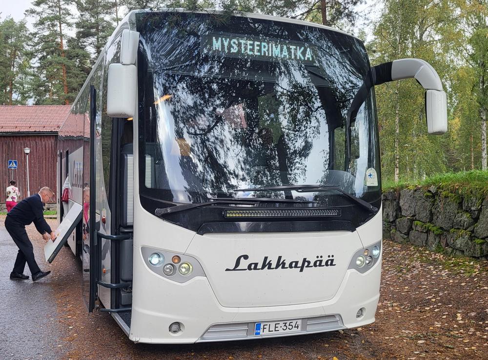 Marolankadun turistipysäkiltä lähdimme tihkusateen saattelemina Lakkapään "oikean kuljettajan" ohjaamina kohti mysteerejä.
