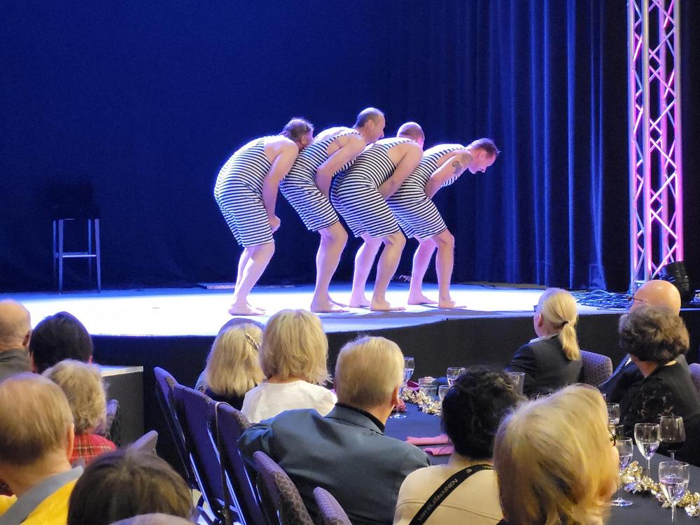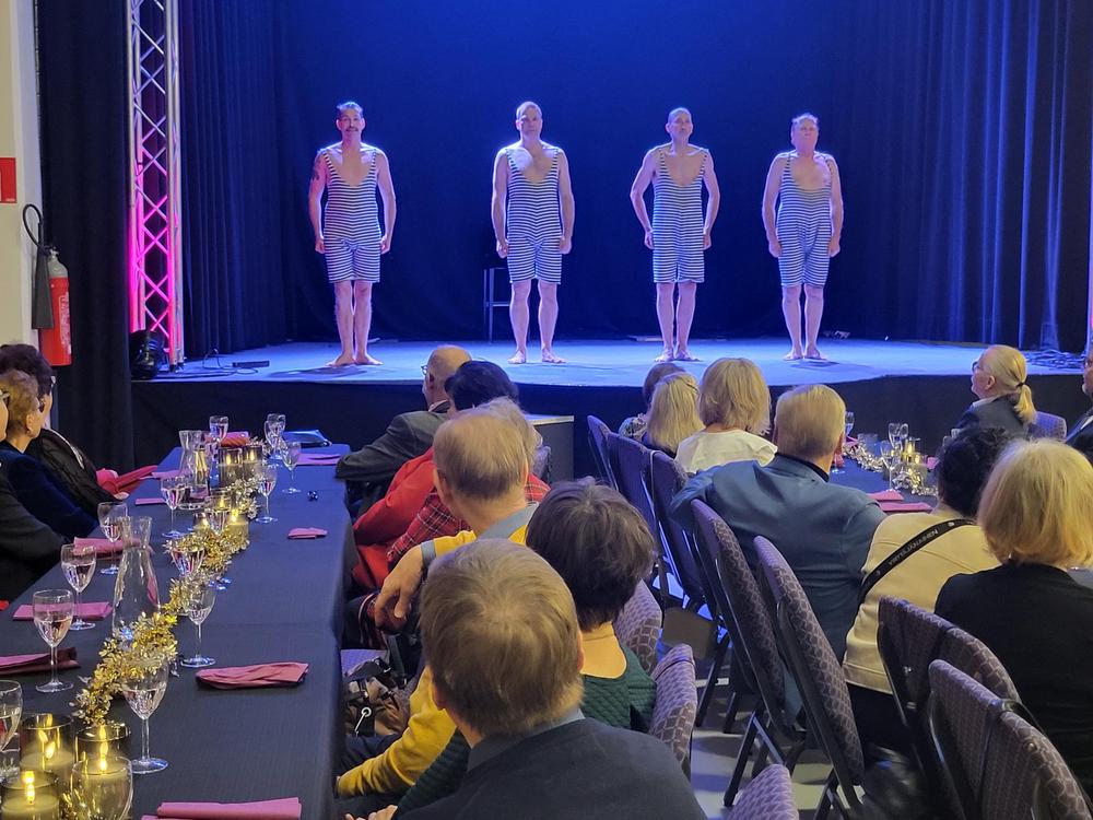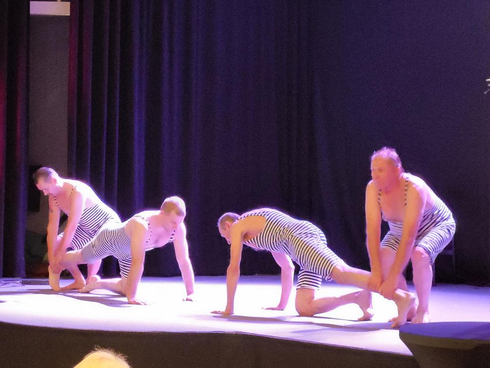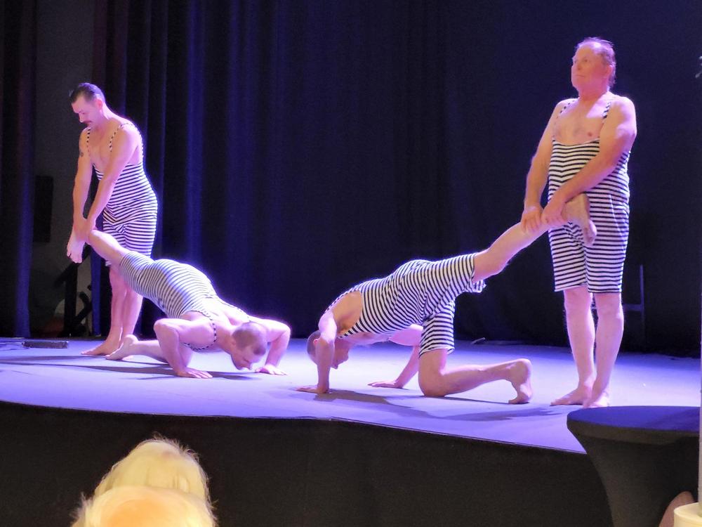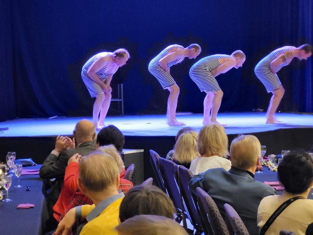 Lounaan jälkeen senioreille esiintyi Mallusjoen hitaat miesvoimistelijat. Esityksen aikana nauru oli herkässä kun voimistelijat tekivät mitä moninaisempia liikkeitä hitaasti edeten.