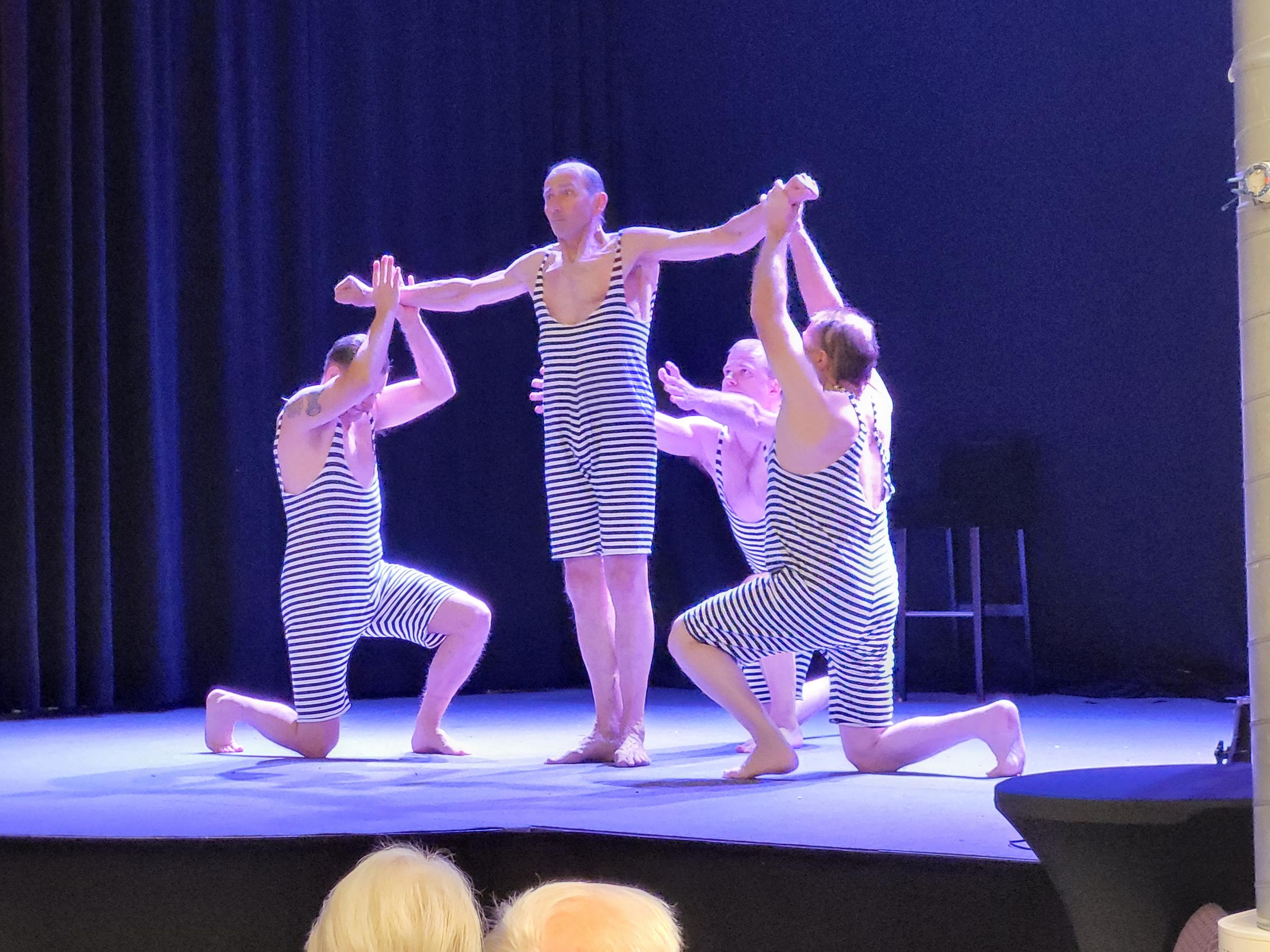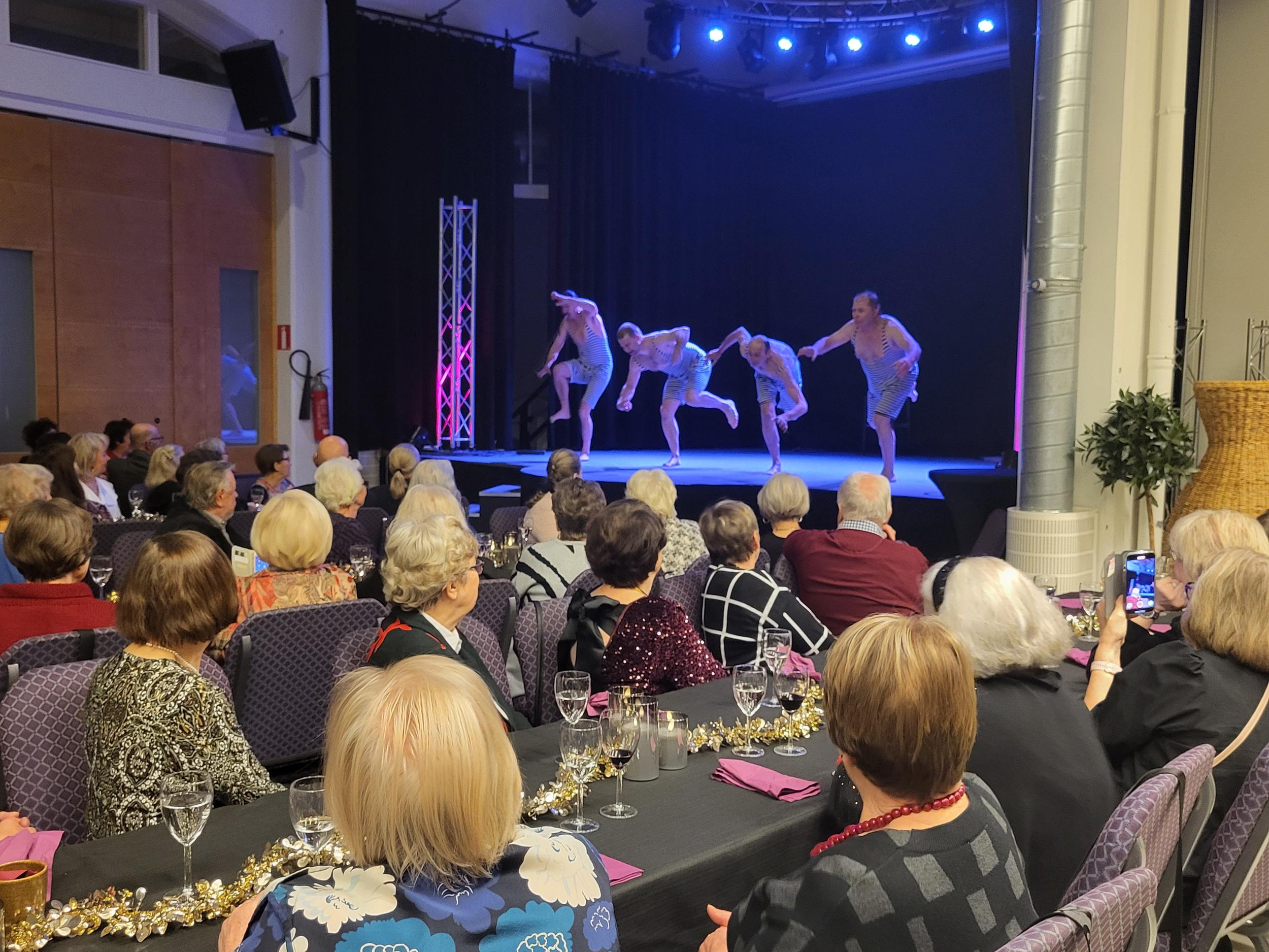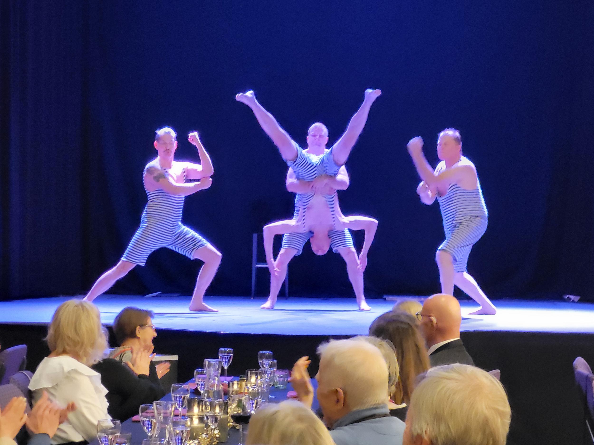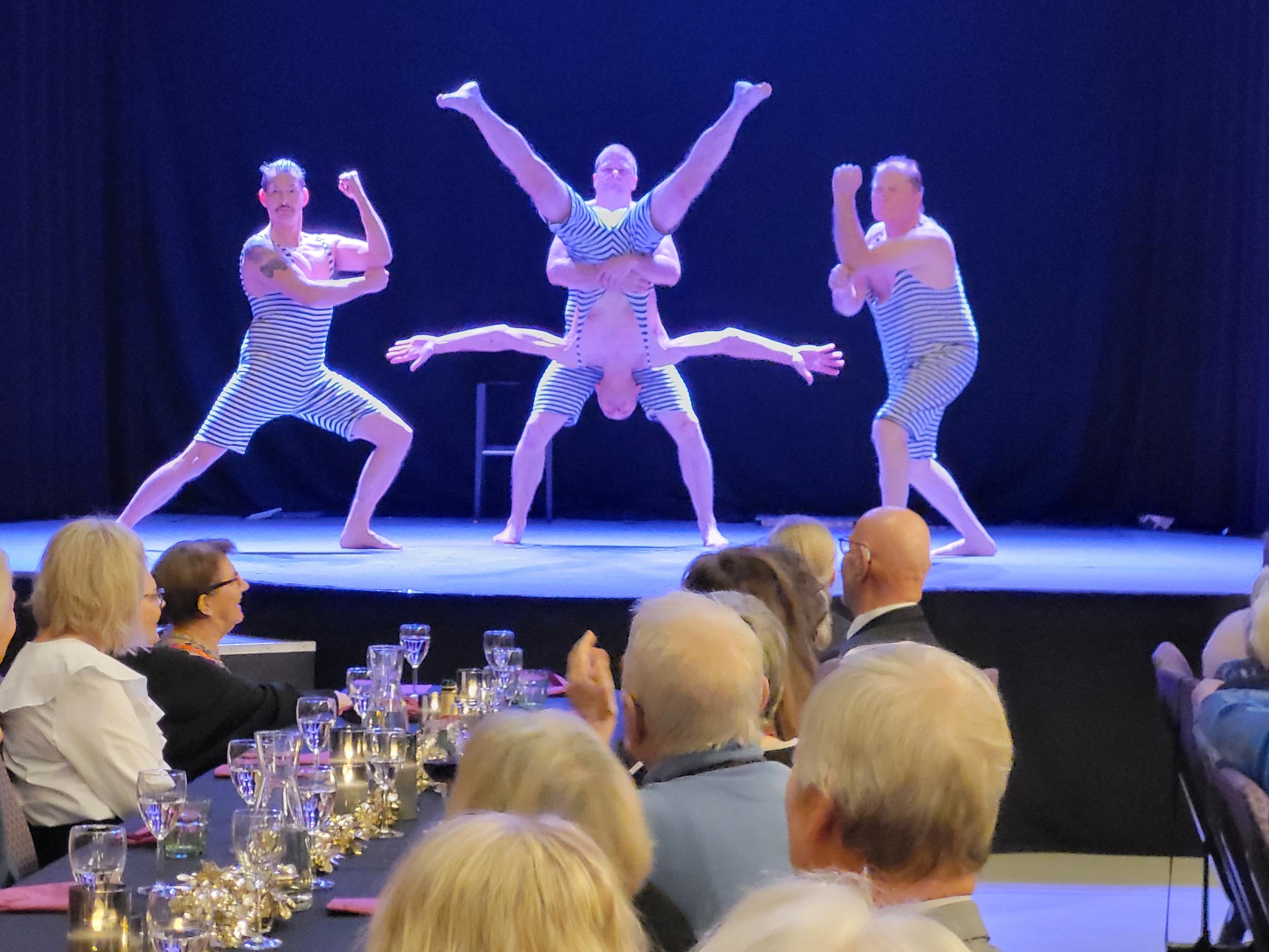 Lounaan jälkeen senioreille esiintyi Mallusjoen hitaat miesvoimistelijat. Esityksen aikana nauru oli herkässä kun voimistelijat tekivät mitä moninaisempia liikkeitä hitaasti edeten.