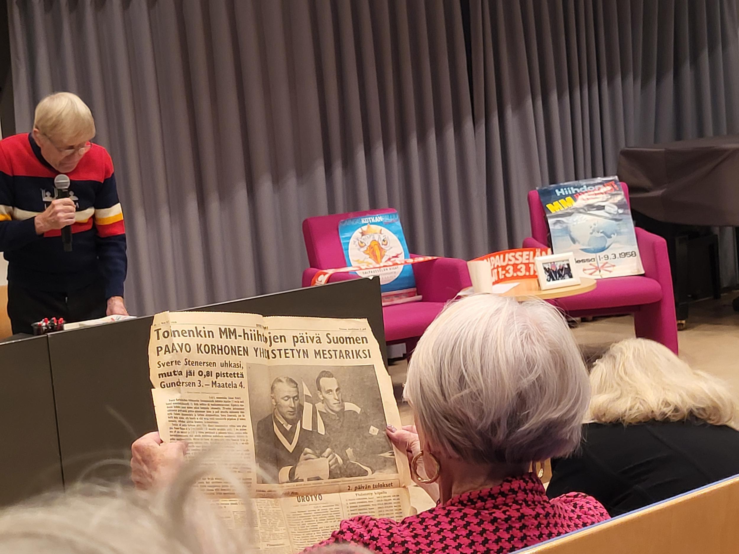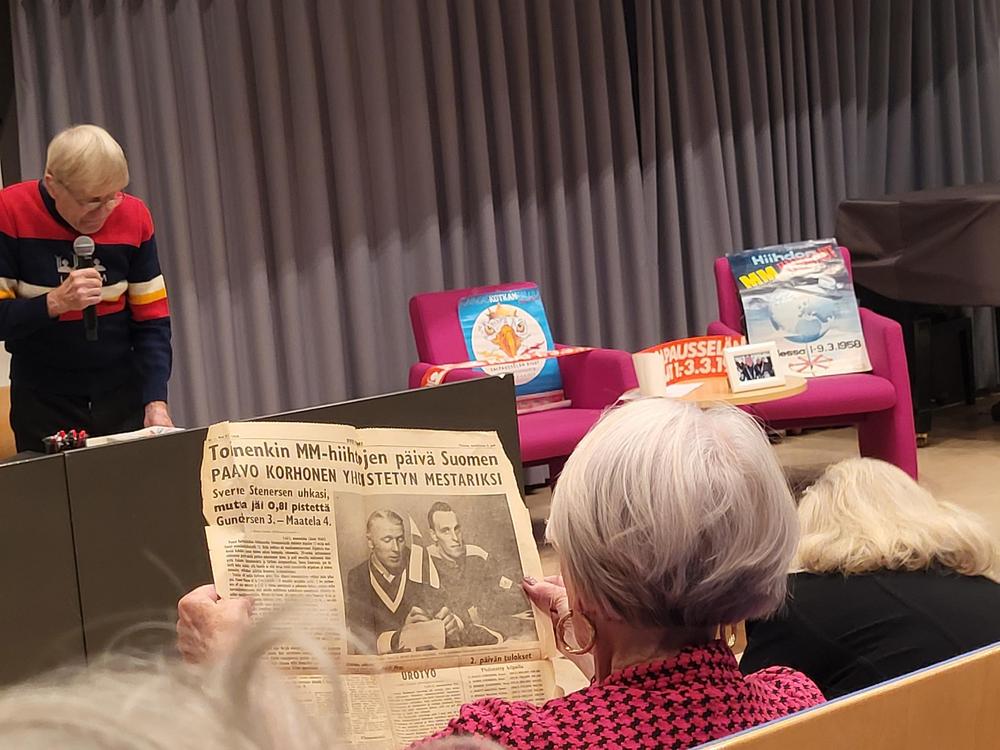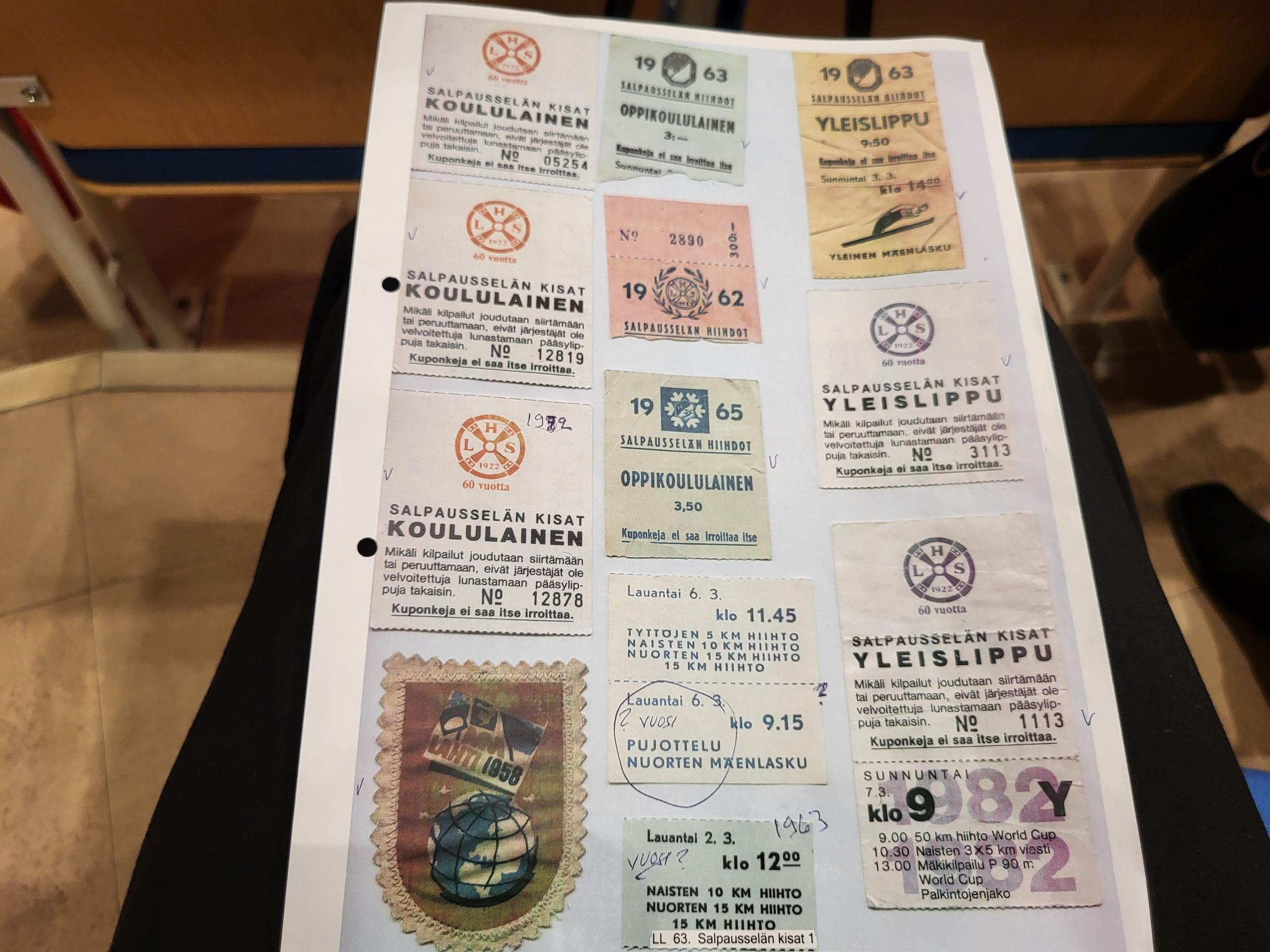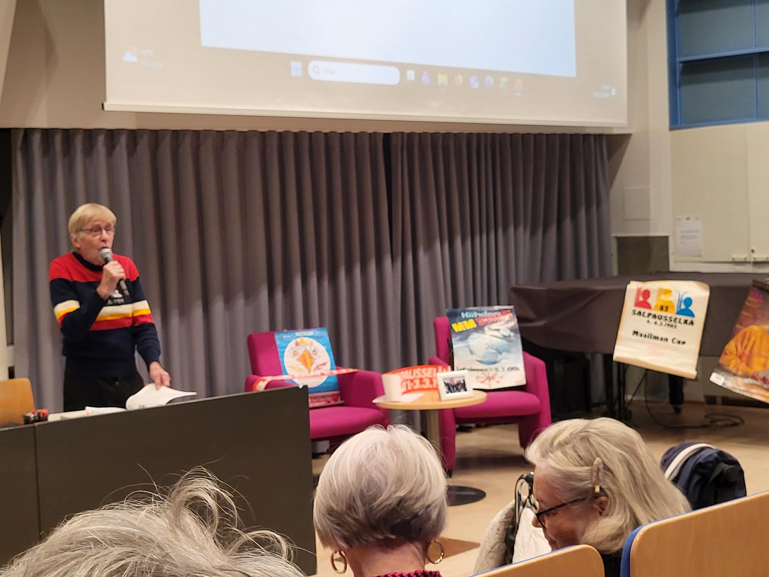 Pekka Nupponen kertoi muistelmia katsojan näkökulmasta ja kierrätti erilaisia lehtiartikkeleita, ohjelmia, pääsylippuja ja muuta vanhaa materiaalia Salpausselän kisoista vuosien varrelta.