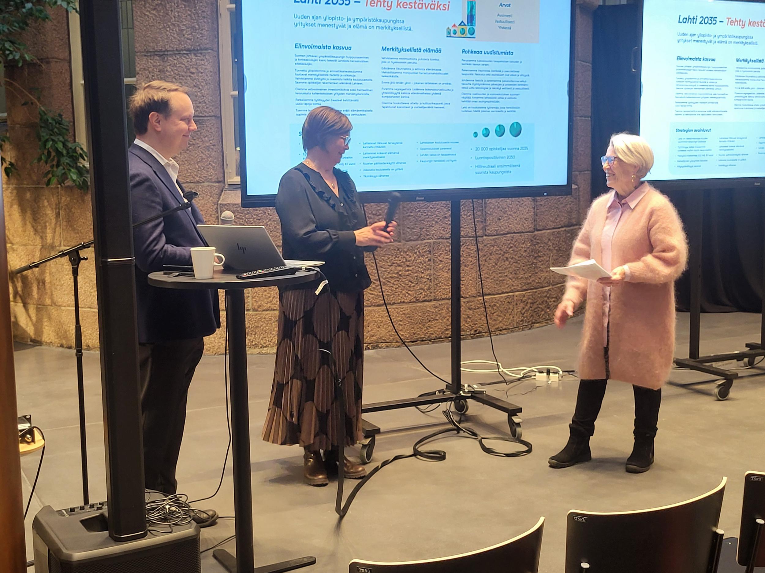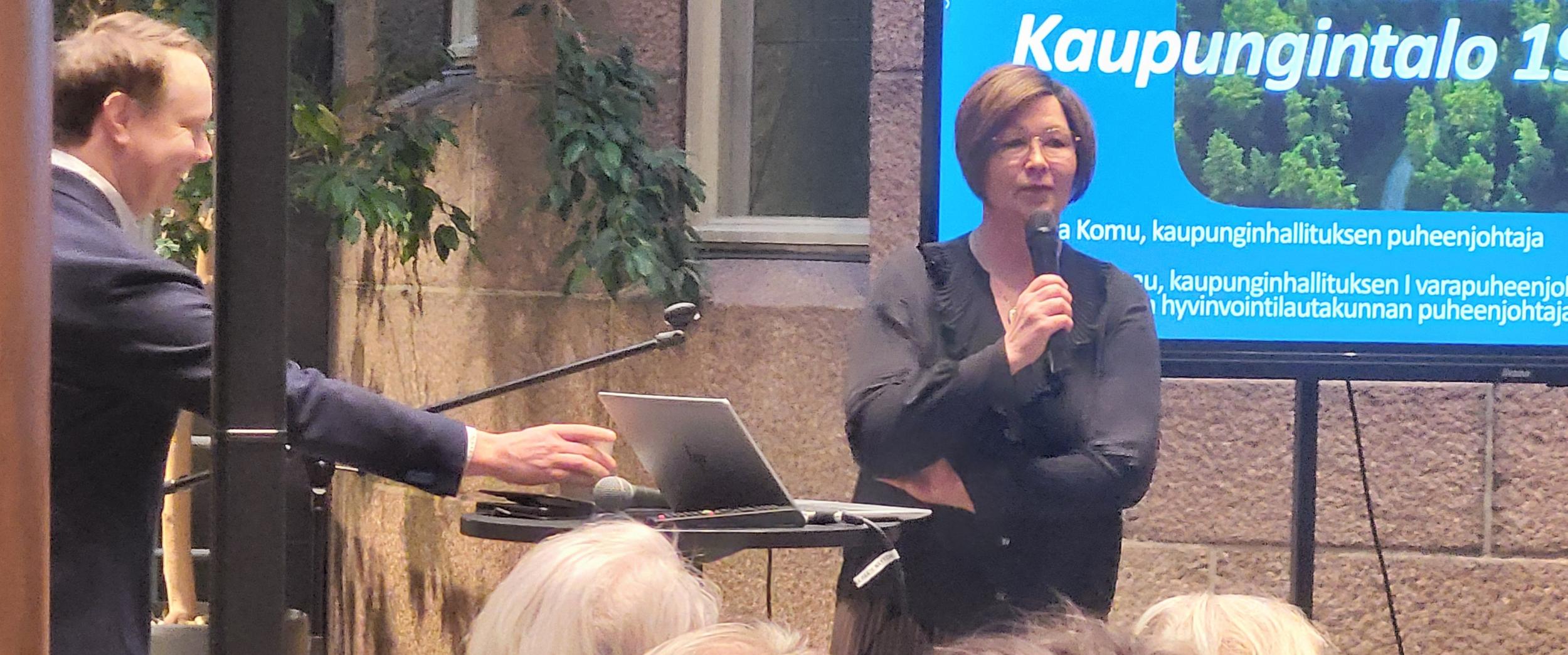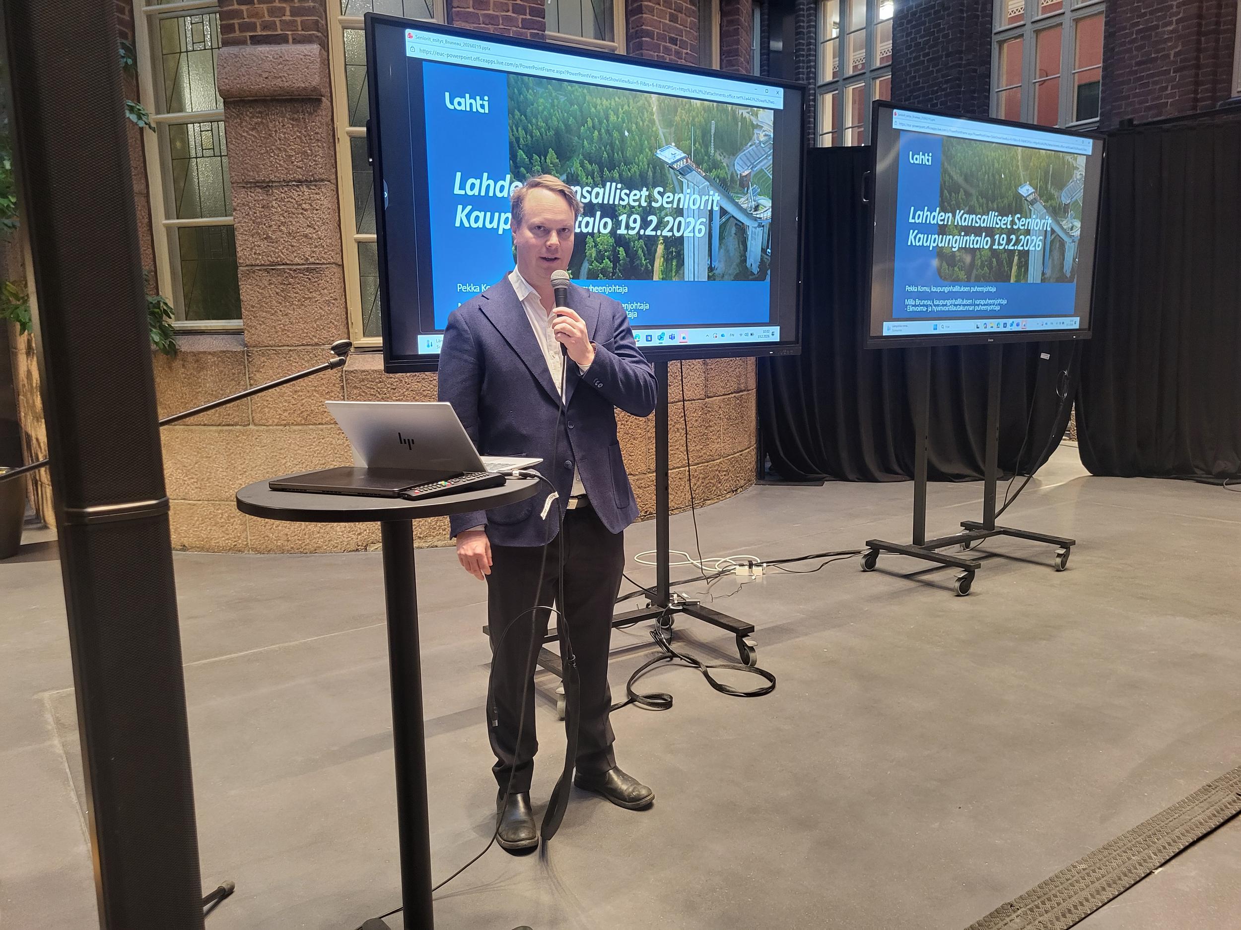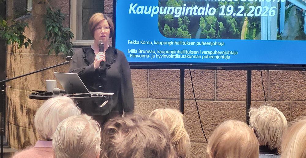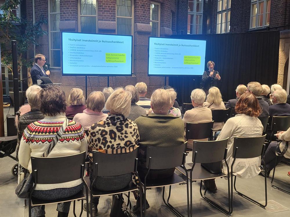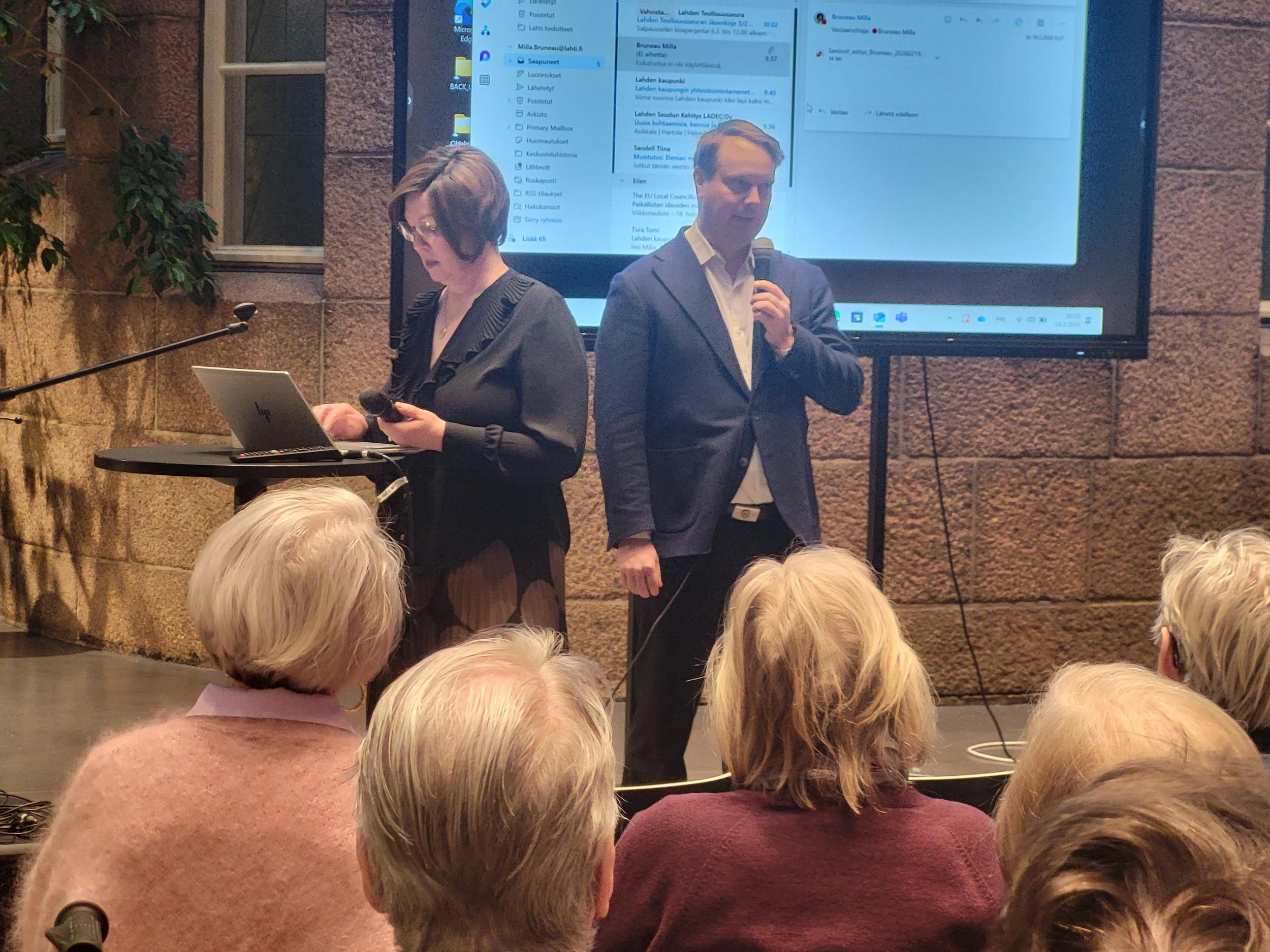 Pirteässä pakkasaamussa 40 senioria suunnisti Lahden Kaupungintalolle Milla Bruneaun ja Pekka Komun vieraiksi. Joimme ensin aamukahvit ja sen jälkeen Pekka Komu, kaupunginhallituksen puheenjohtaja ja Milla Bruneau, kaupunginhallituksen 1. varapuheenjohtaja, kertoivat meille päätöksenteosta ja tulevaisuuden suunnasta Lahden kaupungissa.