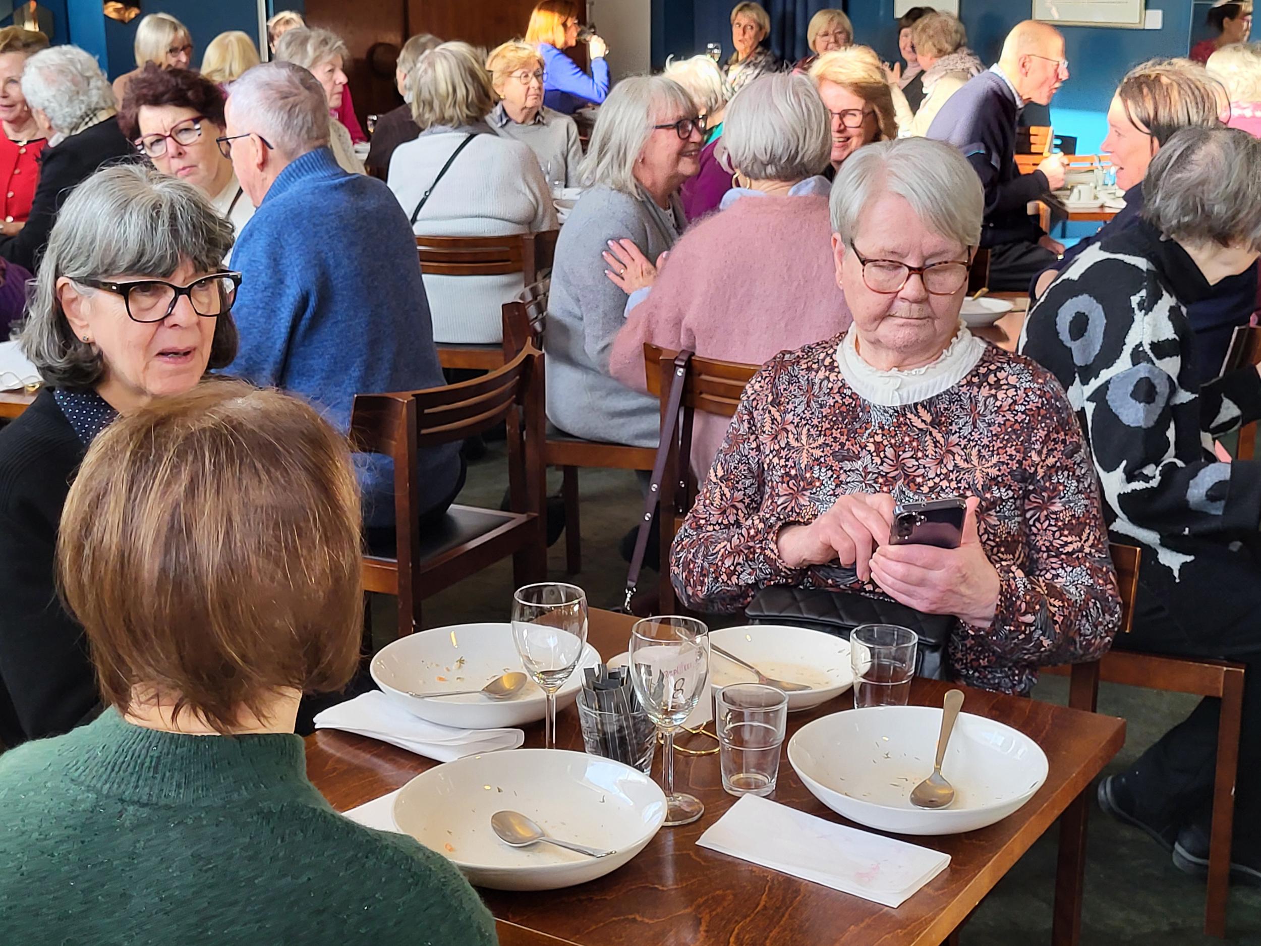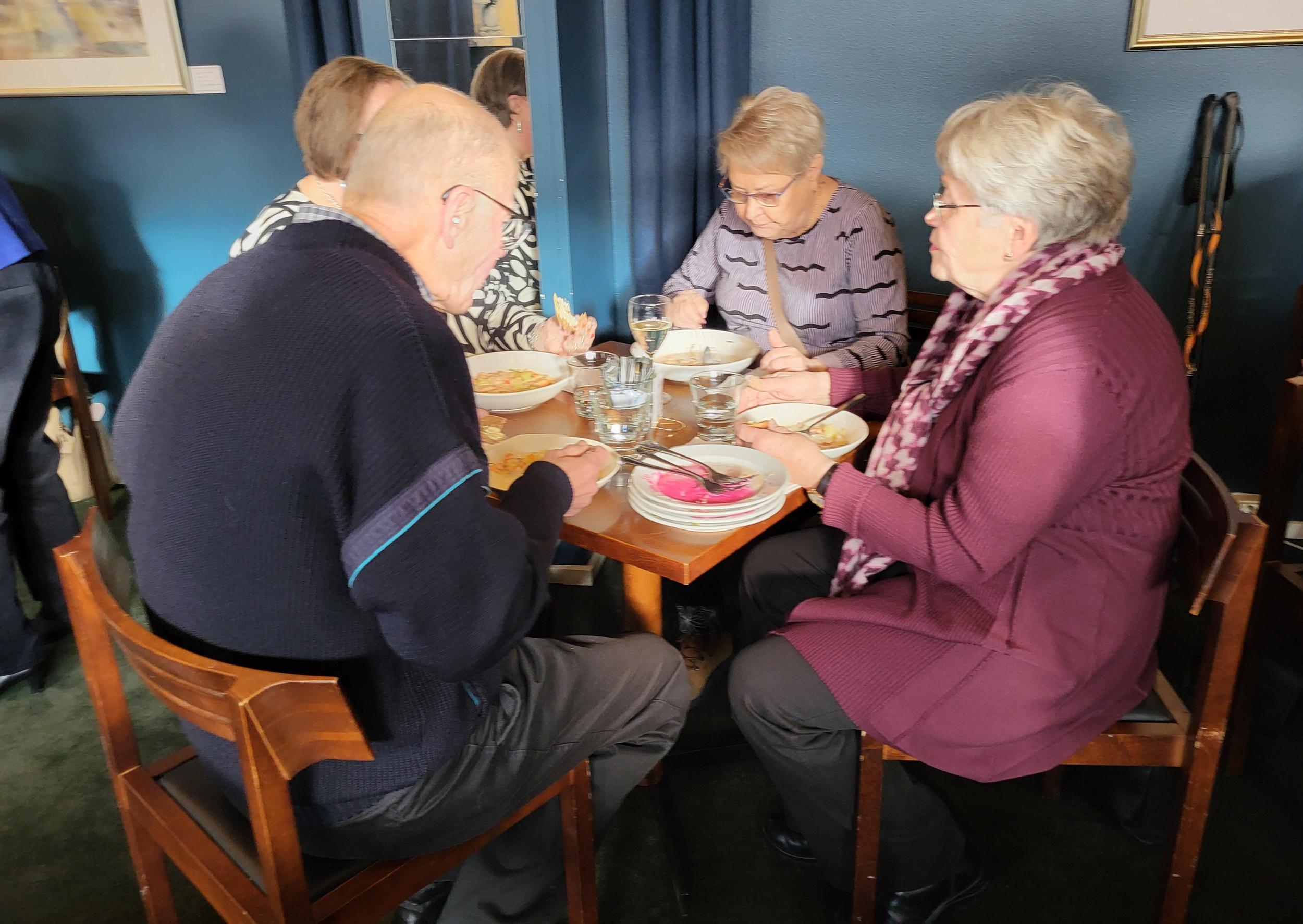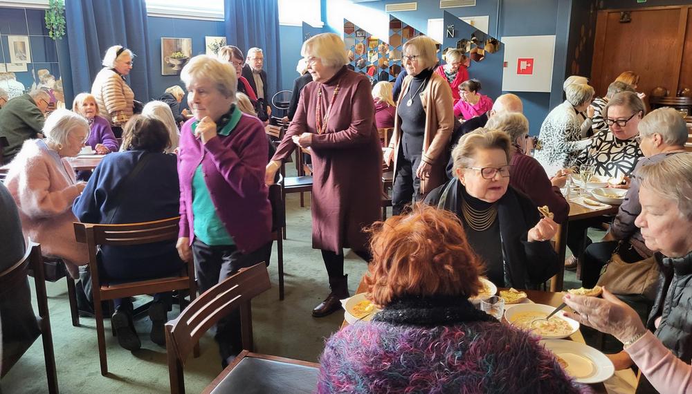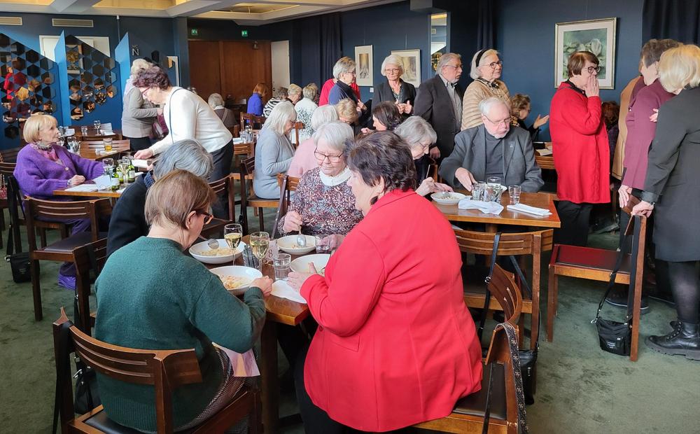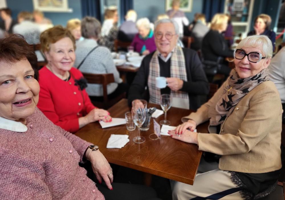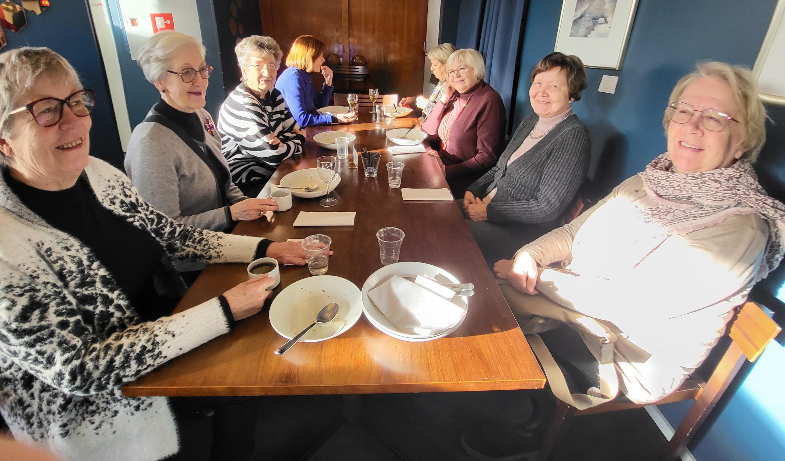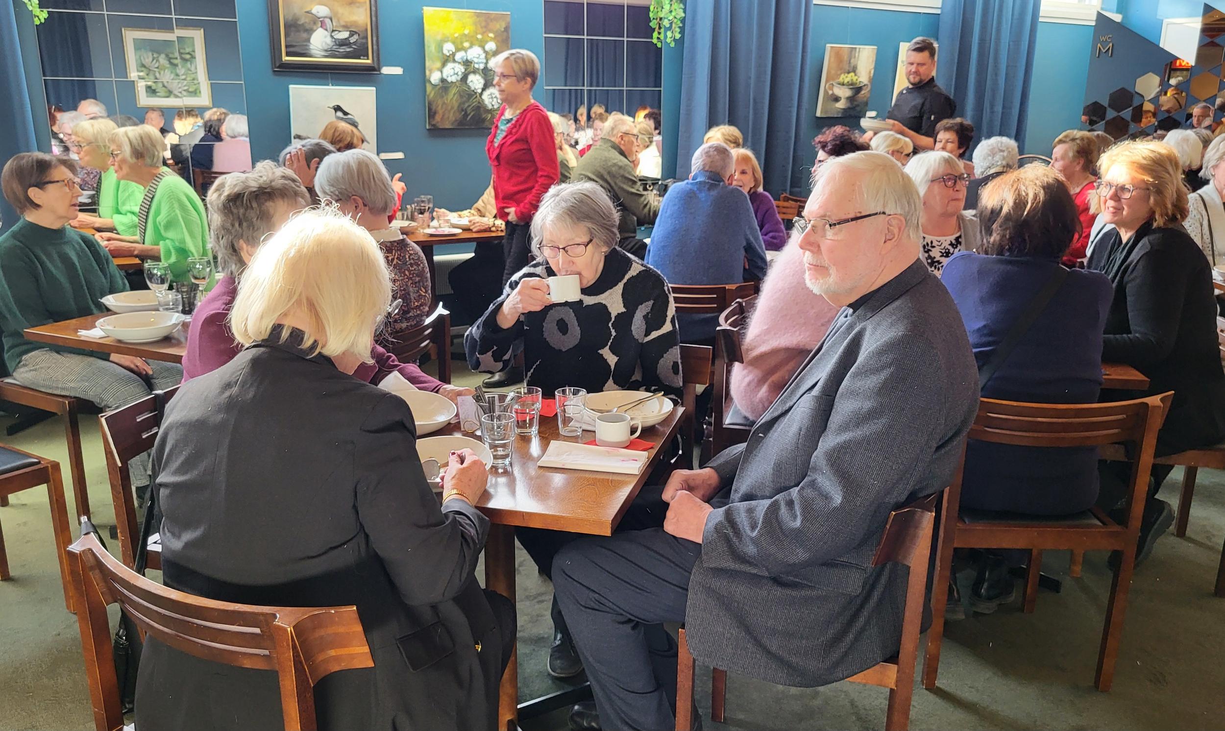 Nautimme ennen esitystä maittavan lounaan Teatterin ravintolasalissa rupatellen ja tutustuen toisiimme. Muutaman henkilön eksyminen väärään porukkaankin aiheutti hilpeyttä ja riemukasta puhetta lounaan lomassa.