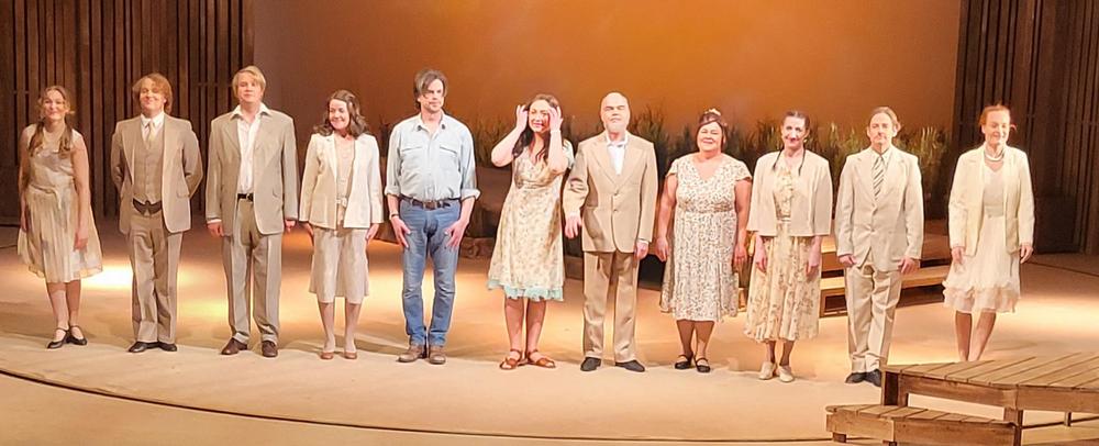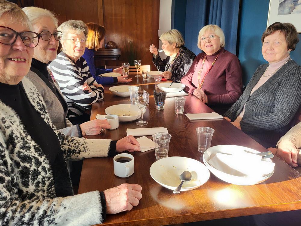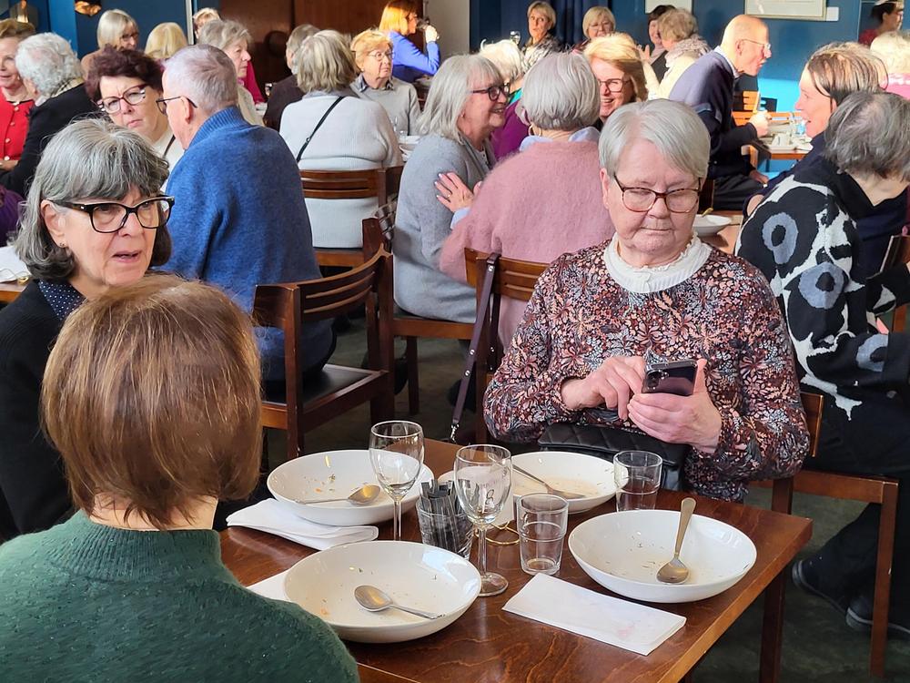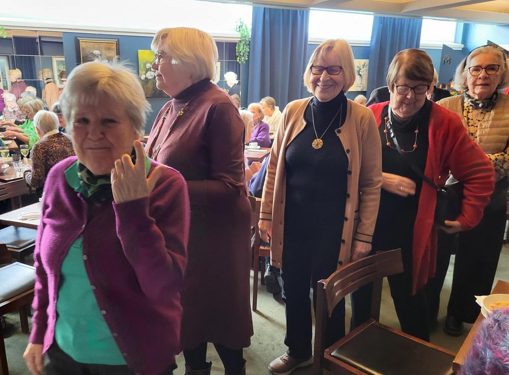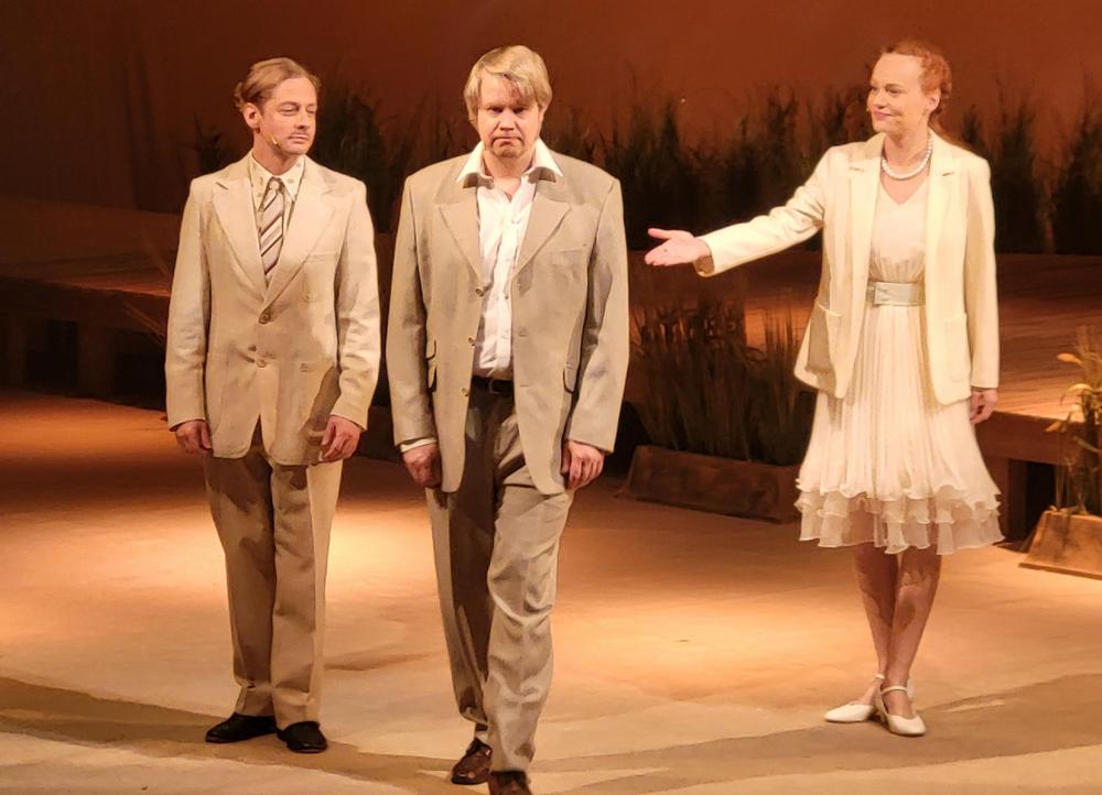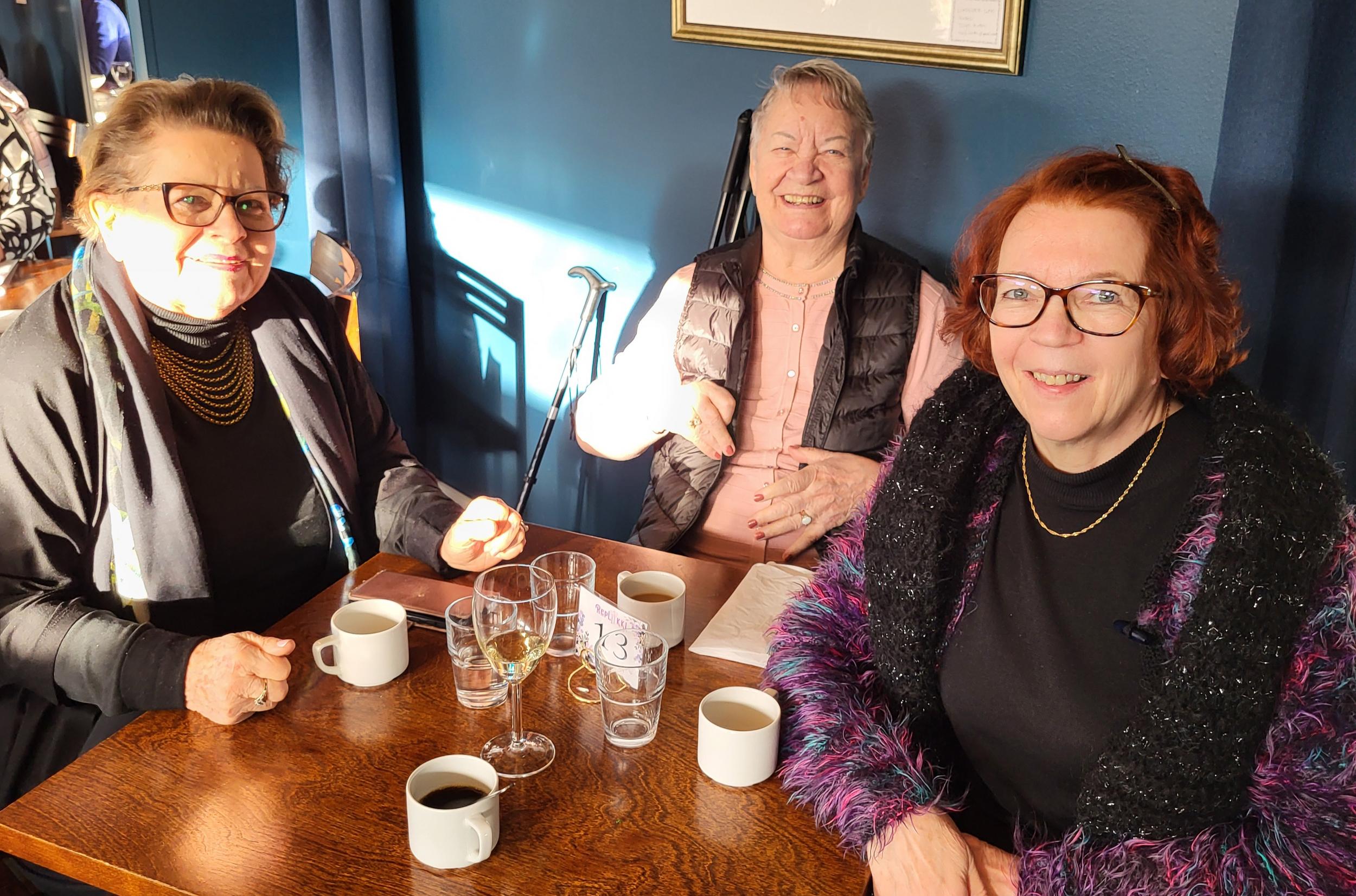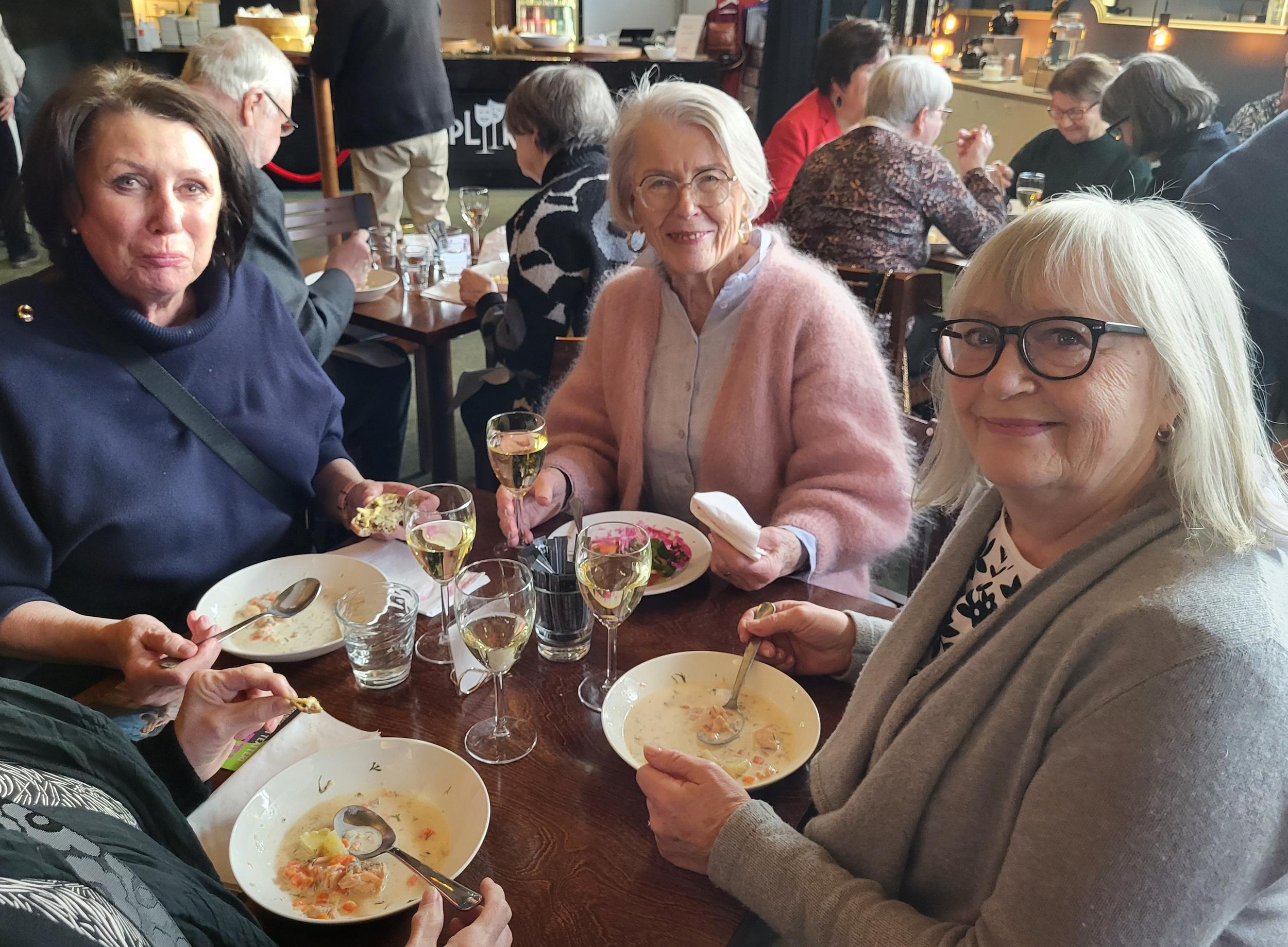 Nautimme ennen esitystä maittavan lounaan Teatterin ravintolasalissa rupatellen ja tutustuen toisiimme. Muutaman henkilön eksyminen väärään porukkaankin aiheutti hilpeyttä ja riemukasta puhetta lounaan lomassa.